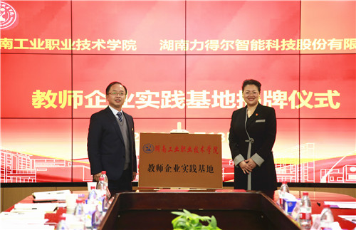 湖南力得尔智能科技股份有限公司董事长金卉与我校副校长李强(左)为教师企业实践基地揭牌