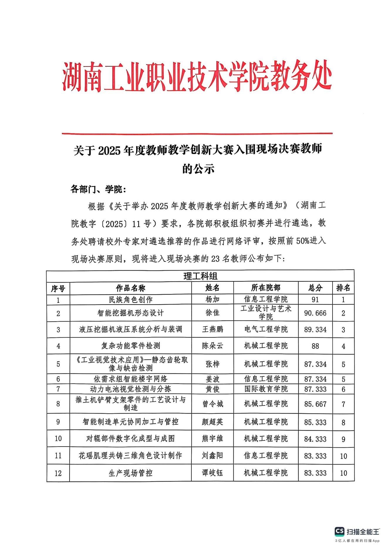 关于2025年度教师教学创新大赛入围现场决赛教师的公示